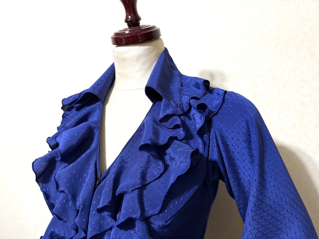 ・シャツ衿、胸元フリル付きブラウス